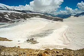 Между плато и ледником Малый Азау расположено моренное озеро, которое практически круглый год сковано льдами.