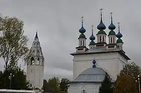 ![]() Панорамный вид храмового комплекса. Троицкая церковь, колокольня, Успенская церковь, Воскресенская церковь (слева направо) | |