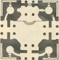 По углам пирамиды расположены четыре кельи, в которых жили монахи, служившие поминальные службы по павшим воинам[2]. Окна в кельи заметны на краях памятника.