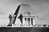 Памятник представляет собой поднятую на высокий постамент двадцатиметровую четырёхугольную усечённую пирамиду со всеми равными измерениями: длиной, шириной и высотой. С четырёх сторон — входы в здание, украшенные греческими портиками и двумя дорическими колоннами. В храм со стороны главного входа ведут 20 широких каменных ступеней, с других — по 12 ступеней.
