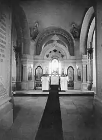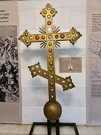 В подвальной части храма-памятника располагался склеп, где были похоронены около 5000 русских солдат[9]. В стены были вмурованы перенесённые с могил надгробия. Были установлены доски с именами погибших офицеров и датами сражений[2].