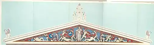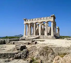 Храм знаменит прежде всего частично сохранившимися скульптурными композициями западного (512—500 гг. до н.э.) и более позднего, восточного (480—470 гг. до н.э.) фронтонов. Композиции изображают эпизоды сражений греков с троянцами, в которых главную роль играет богиня Афина, помогавшая грекам. Сохранилось пятнадцать фигур (десять с западного и пять с восточного фронтона), а также ряд мелких фрагментов. Предполагают, что старый восточный фронтон был разрушен и скульптуры были заменены новыми в 480—470 гг. до н.э. Скульптуры выполняли разные мастера, их имена неизвестны, и до настоящего времени затруднительно установить кого изображают отдельные фигуры. Даже реконструкции расположения фигур на обоих фронтонах вызывают дискуссии специалистов [5]. Есть мнение, что восточный фасад представляет битву с участием Геракла и Теламона, а западный битву с участием Аякса Великого[6]