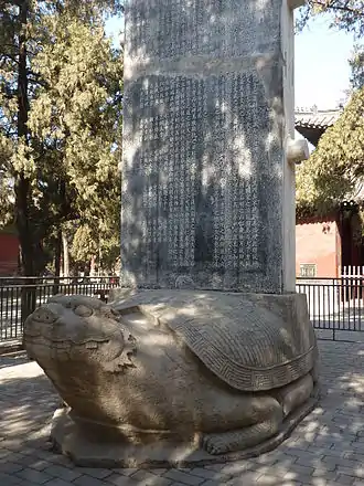 Четыре важные императорские стелы с черепахами времен династии Мин можно найти во внутреннем дворе к югу от «Терема Звезды Литературы». На этой территории есть два павильона со стелами. В восточном павильоне находится стела 4-го года эры Хунву (1371), обозначающая божества, связанные с географическими направлениями и т.д. В западном павильоне находится стела 15-го года эпохи Юнле (1417), посвященная реконструкции храма. Две другие стелы находятся под открытым небом: стела 4-го года эры Чэнхуа (1468) перед восточным павильоном и стела 17-го года эры Хунчжи (1504) перед западным павильоном, также посвященная проектам ремонта храма. В этом районе также расположены десятки более мелких стел без черепах.
