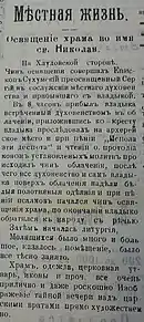 ⟨... ⟩ На Хлудовской стороне сейчас же за парком находятся развалины Хлудовского винного погреба. Общий вид с горы неважный и представляет собой обгоревшие потрескавшиеся каменные столбы перетянутые железными балками. Совершенно другой вид получается на эти же развалины если посмотреть на них со стороны реки. Трехэтажный дом почти весь, с двух сторон, в земле.Первый этаж цел и ремонтируется под молитвенный дом, учрежденного 15 декабря сочинского Свято-Николаевского братства. В окнах первого этажа вделаны решетки. В одном отделении ввиде креста, здесь решено устроить алтарь будущего храма. Средства, частью собранные в Москве и в Сочи, пойдут на внутренний большой ремонт, по облицовке, осушению отсыревших стен, потолка и пола. Весьма внушительный вид представляет помещение подвала ввиде катакомб, с парусными арками, полутемного громадного зала. И напоминает собой церковь древних христиан, прятавшихся на заре христианства в подобныя подземелья.Глубоко молитвенное настроение посетит здесь молящихся, когда в будущем храме разнесутся клубы фимиана, прорезываемого мерцающими свечами и лампадами перед ликами святых. И где будут слышаться прочувственные возгласы священника и пение хора исходящими как бы из таинственного мира, будящего в нас добрые, святые чувства, любви к человеку.Большое начатое дело требует отклика. Этим мы создадим себе маяк милосердия и место, где сможем отрешиться от будничной злобы современных условий жизни. Откликнись же, кто имеет живую душу! ⟨...⟩[5]