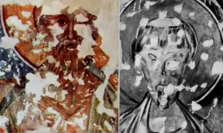 На одной из стен церкви, в которой ночевал Ибн Баттута, он заметил изображение мужчины с мечом и копьём, в головном уборе, похожем на чалму. По словам путешественника, находившийся в церкви человек («монах») назвал изображённого на фреске «пророком Али»[Л 2][Л 19][Л 28][К 8]. «Изображения в древнем храме» видел ещё в 1665 году Эвлия Челеби[Л 30]. Позднее (неясно, в какое время) фрески были закрыты штукатуркой, поэтому путешественники XVIII—XIX веков не упоминали о росписях храма. После того, как были обнаружены остатки росписей храма, стали появляться утверждения о том, что храм был расписан Феофаном Греком. Более того, предположение об авторстве Феофана приписывалось И. Грабарю.