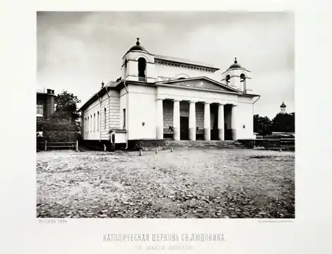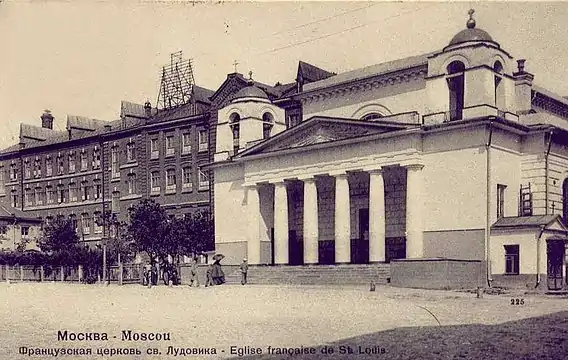 После получения одобрения императрицы Екатерины II и разрешения от московских властей, у господина Протасьева был выкуплен участок между улицей Малой Лубянкой и Милютинским переулком, где была построена небольшая деревянная французская церковь, освящение которой, во имя французского короля Людовика IX Святого, состоялось 30 марта 1791 года. Эта маленькая церковь дала начало будущему островку французской общины, которая получила большое развитие. Московские французы налаживали связи друг с другом, а французские священники пользовались успехом среди русской аристократии как воспитатели детей русского дворянства[3]. В 1792 году архиепископ Станислав Сестренцевич предписал следующее разделение на два католических прихода: в новый (св. Людовика) переходят все подданные французского королевства, выходцы из других стран, где говорят по-французски, могут раз и навсегда выбрать один из двух приходов, остальные католики — остаются в старом приходе (свв. Петра и Павла)[4].