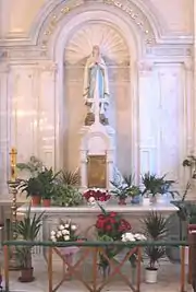 В правом алтаре находилась статуя Пресвятой Девы Марии — Царицы Розария, впоследствии заменённая на статую Пресвятой Девы Марии Лурдской[11]. Однако надпись на французском языке над статуей гласит: «Царица Святого Розария, молись о нас». После советского периода сохранился лишь один старинный витраж с изображением св. Иосифа, находящийся в правой части храма.