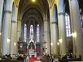| Боковой алтарь Девы Марии и шести святых чешских покровителей | Главный алтарь храма | Роза главного фасада с символами четырёх евангелистов | Боковой алтарь Святых Кирилла и Мефодия |