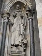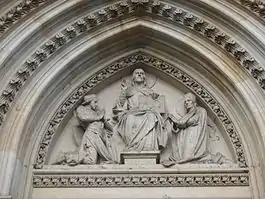 | Статуя Святого Прокопа в нише у главного входа в храм | Храм Святой Людмилы на площади Мира | Тимпан над главным входом в храм. «Христос, благословляющий Святого Вацлава и Святую Людмилу», Йозеф Вацлав Мысльбек | Неоготический фасад храма |