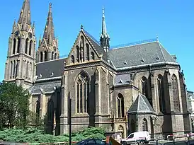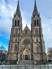 Над главным входом находится центральный портал, тимпан которого украшен рельефом «Христос, благословляющий Святого Вацлава и Святую Людмилу» работы Йосефа Вацлава Мысльбека. Тимпан венчают рельефные изображения Бога Отца и Святого Духа (в виде голубя) также работы Мысльбека. Щипец главного фасада украшен скульптурой Святой Людмилы работы Л. Шимека. Щипецы трансепта украшены статуями Святых Кирилла и Мефодия работы Бернарда Отто Сеелинга (1892 год). Вокруг розы главного фасада находятся символы четырёх евангелистов работы Йосефа Чапека. В нижних нишах фасада по обе стороны от главного входа находятся статуи Святого Прокопа и Святого Войтеха работы Фр. Гергеселла и Антонина Прохазки. К главному входу ведёт массивная лестница[2][5][6].