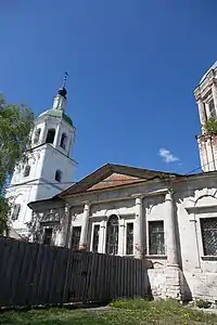 У колокольни — два четверика и восьмерик с приподнятой криволинейной кровлей; в своих формах они успешно развивают архитектурную тему, уже заданную храмом.