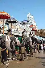 В течение «брахмотсавам» фестивальное мурти Малайяппа свами вместе со своими двумя супругами, богинями Шри-деви и Бху-деви, участвует в процессии вокруг храма. Их провозят по улицам на колесницах, оформленных как ездовые животные и птицы. Впереди процессии движется пустая колесница, в которой, как считается, незримо находится сам бог Брахма. Фестивальные колесницы представляют художественные шедевры и символизируют ваханы. Колесницы изображают различные фигуры, включая змея Ананта-Шешу, птицу Гаруду, чакру Сударшану, дерево исполнения желаний Кальпаврикшу, льва и другие. Празднование «брахмотсавам» привлекает паломников и туристов со всей Индии и из других стран[29].