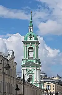 Наиболее значительной частью ансамбля является колокольня, в архитектуре которой зрелый классицизм сочетается с приёмами середины XVIII в. Богатая пластика трех четвериков колокольни связана с её ролью организующей вертикали в начале Пятницкой улицы. Арочный проём в нижнем ярусе колокольни служит входом на церковный двор, кладка из большемерных кирпичей в подклете, вероятно, является остатками Святых ворот церковной ограды XVII века.