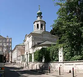 Вдоль красной линии переулка расположен южный фасад четырёхстолпной сводчатой трапезной, соединённой с основным зданием церкви, но воспринимаемой как самостоятельный объём. Учащенный ритм пилястр, раскреповка цоколя и карниза, большие окна в наличниках с «ушками» и выступающими треугольными фронтонами, ложные окна цокольного этажа, соответствующие верхнему ряду окон — всё это придает фасадам трапезной чрезвычайную нарядность и пластическую насыщенность. С запада от здания церкви вместо колокольни во всю ширину торца расположен притвор (нынешний построен около 1880 г.), выделенный на боковых фасадах более широким членением.