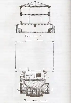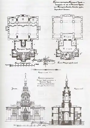| Проект пристройки колокольни | Разрез и план подвала |