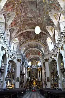 Интерьер храма богато украшен многочисленными фресками. Свод храма расписывал художник Иоганн Георг Этгенс (нем. Johann Georg Etgens). Внушительный мраморный алтарь был создан в 1761 году Йозефом Штерном (нем. Josef Stern). По периметру нефа, в нишах расположены мраморные и деревянные статуи, некоторые из них датируются XIII-XIV веками.