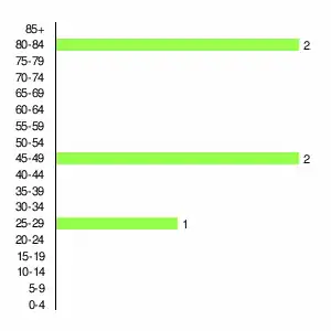 | Жителей | 390 | 451 | 424 | 210 | 66 | 36 | 25 | 19 | 5 |