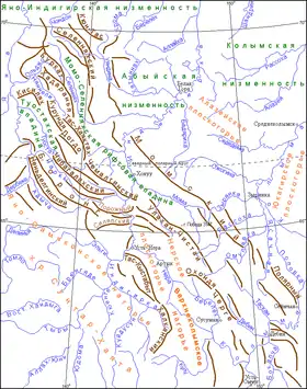 В западной части горной системы, в междуречье Яны и Индигирки располагаются хребты Хадаранья (до 2185 м), Тас-Хаяхтах (2356 м), Чемалгинский (2547 м), Курундя (1919 м), Догдо (2272 м), Чибагалахский (2449 м), Боронг (2681 м), Силяпский (2703 м) и др. На востоке, в верховьях Колымы, — хребты Улахан-Чистай (высшая точка г. Победа — 3003 м), Черге (2332 м) и др.