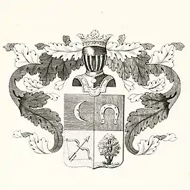 Щит разделен на четыре части, из них в первой части, в голубом поле, изображен золотой полумесяц, рогами в левую сторону. Во второй части, в красном поле, серебряная подкова, шипами вниз (польский герб ЯстржембецВ третьей в золотом поле лук с стрелою, острием обращенною к левому верхнему углу (изм. польский герб ЛукВ четвёртой части в серебряном поле находится дерево.