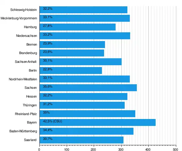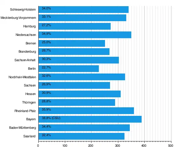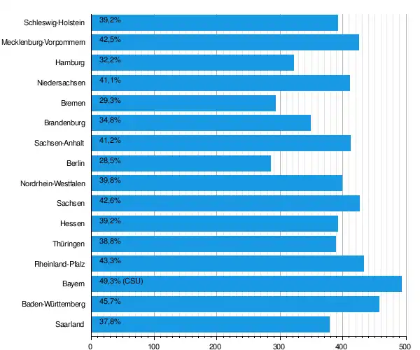 | Поддержка партии на федеральных выборах 2009 года по землям: пропорциональное голосование |