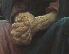 Сдержанность в изображении одежды позволяет художнику придать основное значение лицу и рукам Христа, которые создают психологическую убедительность и человечность образа[10]. Крепко сжатые кисти рук находятся практически в самом геометрическом центре холста. Вместе с лицом Христа они представляют собой смысловой и эмоциональный центр композиции, притягивающий к себе внимание зрителя[8]. Сцепленные руки, находящиеся на уровне линии горизонта, «в судорожно-волевом напряжении словно пытаются связать, подобно замковому камню, весь мир — небо и землю — воедино»[12]. Босые ноги Христа изранены от долгого хождения по острым камням[10].