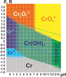 Для хрома характерны степени окисления +2, +3 и +6 (см. табл.). Практически все соединения хрома окрашены[8].