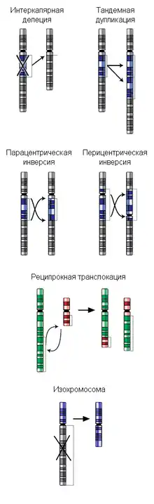 Хромосомные перестройки (хромосомные мутации, или хромосомные аберрации) — тип мутаций, которые изменяют структуру хромосом. Классифицируют следующие виды хромосомных перестроек: делеции (утрата участка хромосомы), инверсии (изменение порядка генов участка хромосомы на обратный), дупликации (повторение участка хромосомы), транслокации (перенос участка хромосомы на другую), а также дицентрические и кольцевые хромосомы. Известны также изохромосомы, несущие два одинаковых плеча. Если перестройка изменяет структуру одной хромосомы, то такую перестройку называют внутрихромосомной (инверсии, делеции, дупликации, кольцевые хромосомы), если же двух разных, то межхромосомной (дупликации, транслокации, дицентрические хромосомы). Хромосомные перестройки подразделяют также на сбалансированные и несбалансированные. Сбалансированные перестройки (инверсии, реципрокные транслокации) не приводят к потере или добавлению генетического материала при формировании, поэтому их носители, как правило, фенотипически нормальны. Несбалансированные перестройки (делеции и дупликации) меняют дозовое соотношение генов, и, как правило, их носительство сопряжено с существенными отклонениями от нормы.