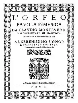 | 1607 | «Орфей» | L'Orfeo | Клаудио Монтеверди | Алессандро Стриджо (итал.) | ![]() | 24 февраля 1607 Палаццо Дукале, Мантуя |