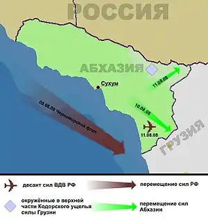 Продвижение российских войск вглубь территории Грузии позволило абхазским вооруженным формированиям заблокировать группировку грузинских войск в зоне грузино-абхазского противостояния[66].