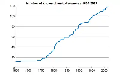 Количество известных человечеству химических элементов в период с 1650 по 2017 год.