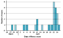 ЦКЗ предупреждает врачей о похожем новом штамме свиного гриппа A (H1N1) в двух случаях в южной Калифорнии. Идут местные расследования, включая расследования в Техасе, общее наблюдение усилено[65][76]. Ассошиэйтед пресс освещает предупреждение. Это первое упоминание о вспышке A (H1N1) в англоязычных СМИ[75][77][78].