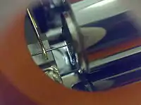 Платино-иридиевая игла сканирующего туннельного микроскопа крупным планом.