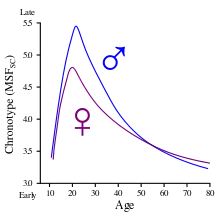 Дети обычно «жаворонки», но с возрастом среди них всё больше становится «сов» — максимум достигается приблизительно к 20 годам (у мужчин в возрасте около 21 года, у женщин — около 19,5 лет). Далее с возрастом хронотип постепенно становится ранним. Мужчины в среднем имеют более поздние хронотипы в течение большей части своей взрослой жизни[7].