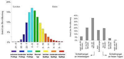 Центр хронобиологии Института медицинской психологии (Мюнхенский университет) выделяет семь хронотипов. В исследованиях хронотип каждого из опрашиваемых (примерно 25 000 человек, в основном из Германии и Швейцарии) определяется параметром MSFsc, который представляет собой время середины сна в выходные дни, MSF (англ. midpoint of sleep on free days), скорректированное по ответам на вопросы[8]. Методика определения хронотипа основана на том, что большинство хронотипов имеют тенденцию накапливать задолженность по сну в рабочие дни, которая компенсируется в выходные дни более продолжительным сном с соответствующим сдвигом середины сна на более поздние часы[7]. На рисунке (см. выше) хронотипы выделены цветом: