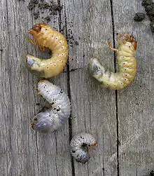 Личинки хрущей относятся к личинкам гипогнатного типа. Они обычно безглазые, с толстым, перегнутым на нижнюю сторону телом и тремя парами ног.