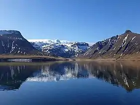 Лавовое поле Берсеркьяхрёйн (исл. Berserkjahraun) и гора Краукюхирдна (исл. Krákuhyrna; 466 м) ограничивают фьорд с востока, а на западе к берегам фьорда подступает гора Гьявамули (исл. Gjafamúli).[6]
