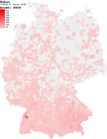 Карта, демонстрирующая частоту распределения фамилии Huber в Германии. Данные на 2005 год