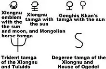 Современный символ монгольских народов соёмбо восходит к хуннскому символу с изображением солнца и луны (см. Флаг Монголии, Герб Монголии, Соёмбо, Флаг Бурятии, Герб Бурятии и Флаг Южной монгольской народной партии)[42][43].