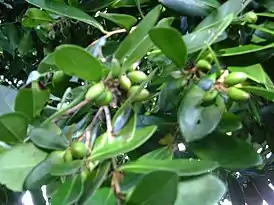 Это — дерево или куст с блестящими кожистыми листьями.