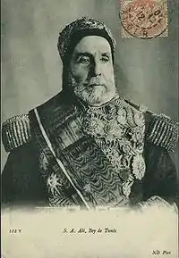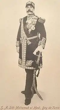 Ему наследовал его младший брат Мухаммад III ас-Садик (1813—1882), правивший в 1859—1881 годах. При нём в 1861 году в Тунисе была введена конституция, согласно которой высшая власть в стране оставалась в руках бея и его министров, но законодательная была передана высшему совету, состоявшему из 60 членов. Судебная власть была объявлена независимой. Бей поощрял строительство железных дорог, портов и телеграфа, думал о реорганизации налоговой системы и армии. Англичане получили разрешение на строительство первой в Тунисе железной дороги от столицы до Ла-Гулеты, а французы — на строительство телеграфа и реставрацию Вагуанского акведука[3]. Но все эти преобразования не принесли никаких положительных сдвигов, а только ускорили закабаление страны. В 1862 году внешний долг Туниса составлял 28 миллионов франков. Мухаммад ас-Садок взял несколько крупных займов у ряда европейских банков, которые не смог погасить. В 1867 году Тунис объявил о своём банкротстве, а в 1869 году была создана Международная финансовая комиссия, под контроль которой бей вынужден был отдать все доходные и расходные статьи тунисского правительства[4]. Руководящую роль в этой комиссии играла Франция, стремившаяся превратить Тунис в свою колонию. В апреле 1881 года 30-тысячная французская армия вступила в Тунис[4]. 12 мая французы окружили бейский дворец Каср-Саид в Бардо и вынудили Мухаммад-бея капитулировать. Бей согласился на введение французских войск и признал переход Туниса под протекторат Франции[4].