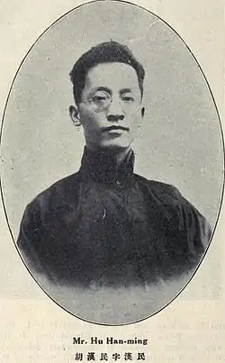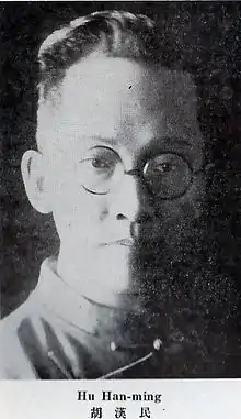 Ху Ханьми́нь (кит. упр. 胡漢民, пиньинь Hú Hànmín; 3 декабря 1879 — 12 мая 1936) — китайский государственный деятель, один из верховных руководителей партии Гоминьдан периода начала её существования и лидер её правого крыла. Председатель Законодательного Юаня Китайской Республики (1928—1931).
