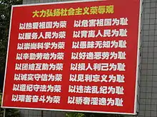 4 марта 2006 года Ху Цзиньтао представил список моральных принципов гражданина КНР, который стал известен под названием «Восемь добродетелей и восемь пороков». Этот список появился на плакатах и стендах в общественных местах. 18 октября 2006 года правительственное информационное агентство «Синьхуа» опубликовало на своём веб-сайте перевод заповедей Ху Цзиньтао на английский язык: