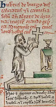 ![]() Хьюберт де Бург на коленях перед алтарем. Хроника Матвея Парижского, XIII век. | |