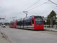 | Состав на улице Мэйн-стрит | Внутри CAF Urbos LRV | Состав на конечной станции Northline Transit Center/HCC | Состав на трамвайной эстакаде | Состав проезжает переезд, оборудованный шлагбаумом |