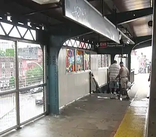 Станция имеет два выхода. Первый выход располагается с восточного конца станции. Лестницы с каждой платформы ведут сразу в город, к перекрестку Бродвея с Хьюс-стрит, минуя мезонин. Мезонин раньше работал, но сейчас находится в аварийном состоянии. Мезонин второго выхода работает, располагается с западного конца станции. С каждой платформы в этот мезонин ведет по одной лестнице. Турникетный павильон второго выхода представлен одними полноростовыми турникетами, работающими только на выход пассажиров. Из мезонина в город ведут две лестницы — к западным углам перекрестка Бродвея и Хупер-стрит.