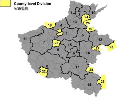 | 24 | Хуасянь | 滑县 | Huá xiàn | Уезд провинциального подчинения | |