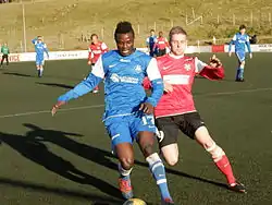 ![]() Йонлейф Хёйгор (справа) борется за мяч с Давидом Асаре | |||||||||||||