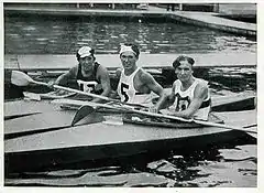 ![]() Берлин 1936, 10км Разборный каяк, слева направо: Грегор Храдецки, Австрия (золото), Анри Эберхардт, Франция (серебро) и Ксавьер Хорманн, Германия (бронза). | |