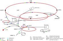 - Linac2, Linac3[2]. Два линейных ускорителя низкоэнергетических частиц. Используются для инжекции частиц в протонный синхротрон (Proton Synchrotron, PS). Один используется для инжекции протонов, другой — тяжёлых ионов. К 2020 году добавится Linac4, который будет разгонять отрицательно заряженные ионы водорода[20].
