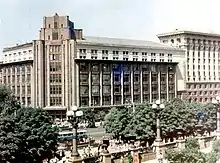 В 1931 году по проекту Киевского филиала Главпроекта на угловом участке развернулось строительство так называемого «Дома учреждений № 2». Его проект выполнили в 1930 году архитекторы Киевглавпроекта в характерных конструктивистских формах. Выразительная лаконичная объёмно-пространственная композиция здания представляла собой два сблокированных под прямым углом контрастных разновысоких объёма — семиэтажный на ул. Ленина (ныне ул. Б. Хмельницкого) с закруглённой башнеобразной угловой частью «врезался» в прямоугольный зальный застеклённый объём на ул. Воровского (ныне Крещатик).